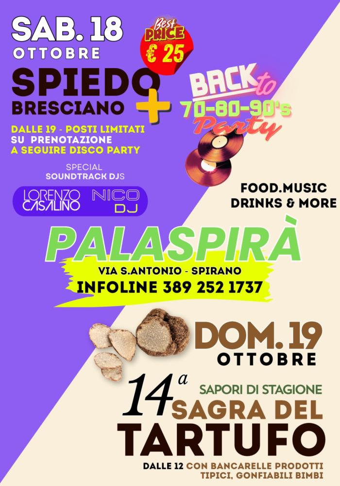 - 01:30 Esclusiva TAAl Palaspirà di Spirano un weekend da non perdere il 18-19 ottobre: torna la Sagra del Tartufo e il grande party “Back to 70-80-90’s con degustazione Spiedo Bresciano