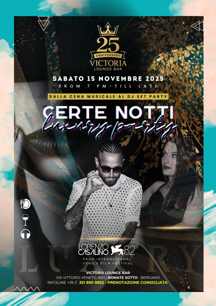 Dopo il grande successo dell’ultimo appuntamento, il Victoria Lounge Bar di Bonate Sotto torna protagonista con un evento elegante e raffinato che fonde gusto, musica e divertimento: “Certe Notti – Luxury Party”, sabato 15 novembre 2025, dalle 20 fino a tarda sera. Un appuntamento che rinnova la magia del locale nel suo 25° anniversario ospitando uno dei format Luxury, brand che ancora una volta è punto di riferimento per l’intrattenimento di qualità nella provincia di Bergamo.