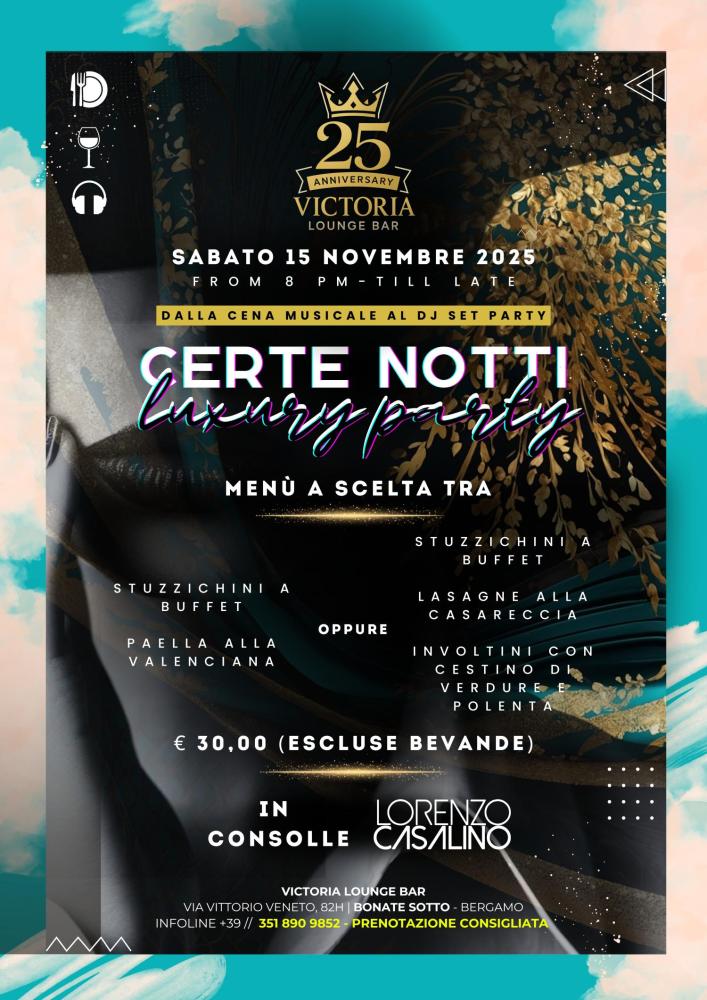 - 18:00 Certe Notti Luxury Party: al Victoria Lounge Bar a Bonate Sotto una serata di classe tra dinner show e DJ set sabato 15 novembre