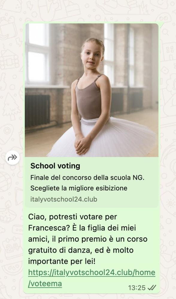 Nello specifico ogni utente è chiamato a blindare il proprio dispositivo con la medesima accortezza. L'attacco hacker non si presenta con virus complessi, ma sfrutta abilmente la buona fede: un messaggio sulla celebre app di messaggistica da parte di un contatto noto chiede un voto urgente per un concorso di danza di una bambina. Cliccando sul link allegato, la pagina web fasulla richiede l'inserimento del proprio numero di telefono e di un codice di verifica inviato via SMS.