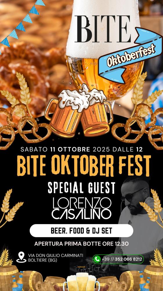 MUSICA E DIVERTIMENTO – A rendere indimenticabile la giornata sarà anche lo speciale Dj Set curato da Luxury Eventi, brand d'intrattenimento e di riferimento nella provincia e città di Bergamo. A curare la colonna sonora, l'artista bergamasco Lorenzo Casalino, reduce dalla sua prestigiosa apparizione in uno dei party esclusivi tenutosi durante l'ultima edizione della Mostra Internazionale del Cinema di Venezia. Il suo DJ set accompagnerà la festa nel pomeriggio, in un crescendo di energia e ritmo capace di trasformare l’Oktoberfest del Bite in una vera e propria esperienza collettiva.