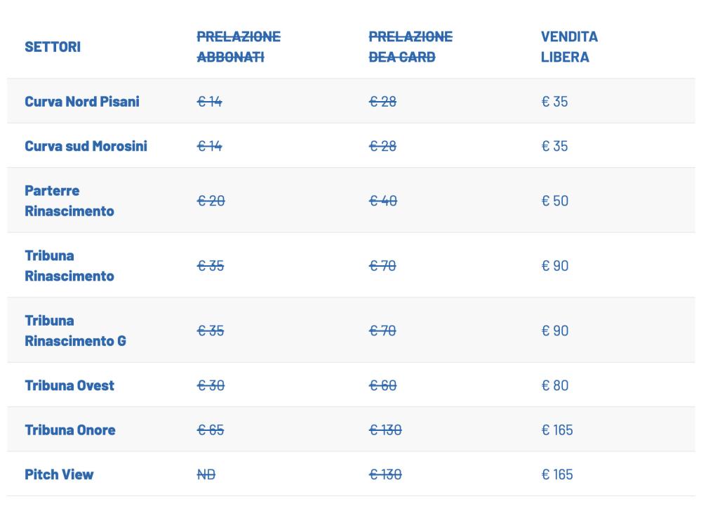 Chiusa sia la PRELAZIONE ABBONATI che la PRELAZIONE DEA CARD, è ora aperta la VENDITA LIBERA. I biglietti saranno acquistabili, salvo esaurimento, sino al fischio d’inizio della partita. Per gli acquisti online, nei settori Curva Nord Pisani e Curva Sud Morosini, è necessario il caricamento in digitale su Dea Card emessa prima del 20 gennaio incluso.