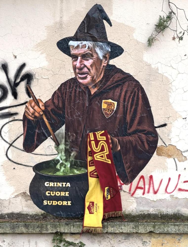 Un nuovo murales dedicato a Gian Piero Gasperini ha colorato le strade della Garbatella. L’opera, firmata dallo street artist Drugi, ritrae l’attuale tecnico della Roma nelle vesti di un mago: cappello appuntito, sciarpa giallorossa e un grande calderone in cui ribolle la sua “ricetta” calcistica.