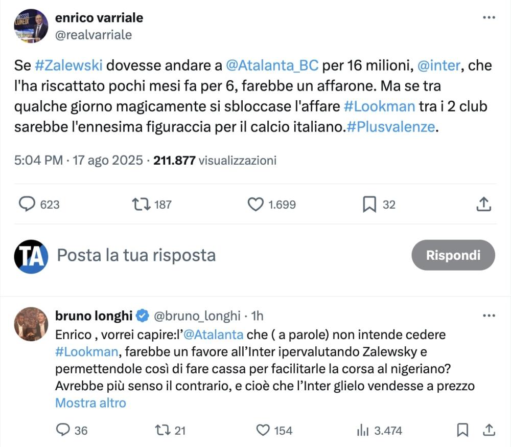 Un nuovo fronte di polemica si accende nel calcio italiano, non sul campo ma sui Social. A innescare il dibattito è stato Enrico Varriale, che sul proprio profilo X ha commentato con toni critici la trattativa che porterà Nicola Zalewski dall’Inter all’Atalanta per una cifra vicina ai 17 milioni di euro.