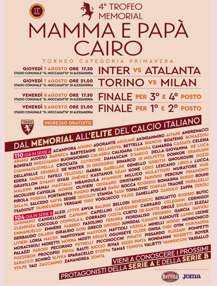 UN TORNEO CHE FA STORIA - Nato nel 2013 per onorare la memoria della signora Maria Giulia Castelli Cairo, madre del presidente del Torino Urbano Cairo, il torneo è stato sospeso soltanto per due anni a causa della pandemia. Dal 2022 ha cambiato denominazione, includendo nel ricordo anche Giuseppe Cairo, papà di Urbano e storico vicepresidente granata scomparso lo scorso anno. L’albo d’oro della manifestazione testimonia il suo prestigio: ben 110 giocatori passati da questo torneo sono approdati in Serie A, mentre 104 hanno trovato spazio in Serie B. Nomi come Bellanova, Di Gregorio, Dimarco, Kean e Yildiz sono soltanto alcuni esempi.