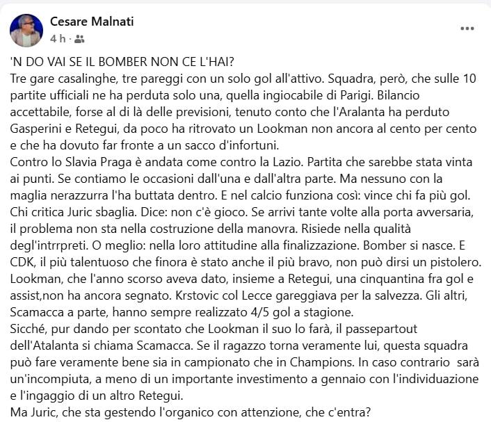 L’Atalanta domina, convince, crea, ma non segna. È questo, in sintesi, il concetto espresso da Cesare Malnati, firma storica de L’Eco di Bergamo e volto noto di Bergamo TV, che attraverso il suo profilo ufficiale Facebook ha condiviso una riflessione profonda — e al tempo stesso ironica — dopo il pareggio senza reti contro lo Slavia Praga in Champions League. Il titolo del suo post, in dialetto bergamasco, è già un manifesto: «’N do vai se il bomber non ce l’hai?». Una domanda semplice, quasi popolare, ma che fotografa perfettamente il problema attuale della squadra di Ivan Juric: la mancanza di un vero finalizzatore.