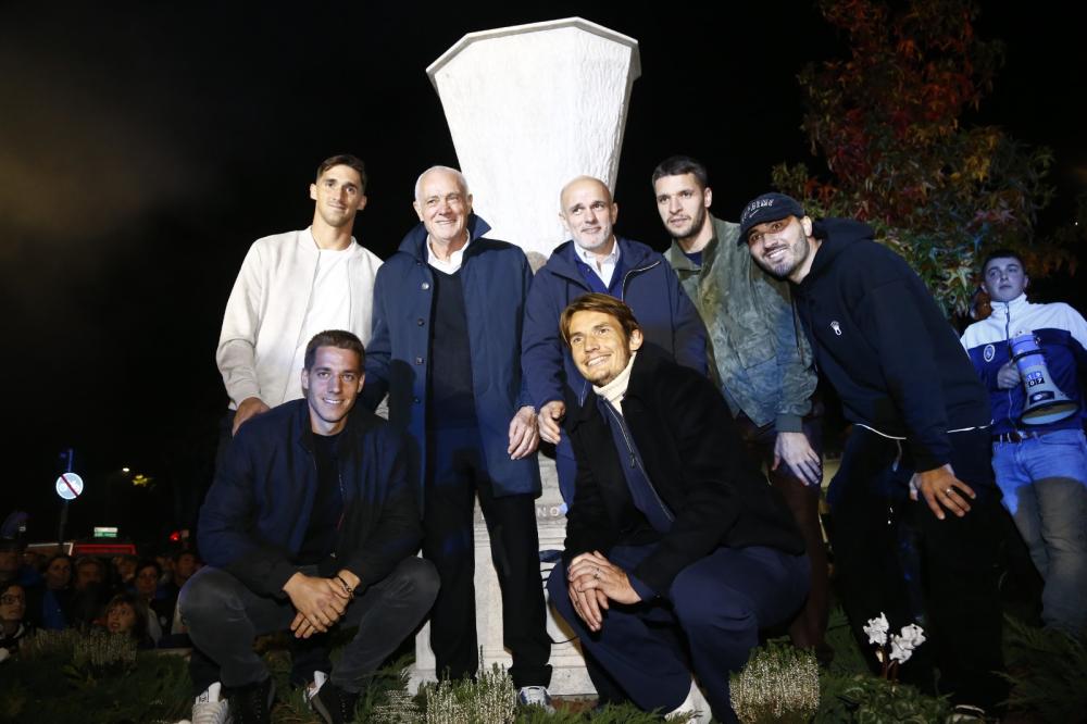 Un boato di emozione ha accompagnato il momento in cui il telo è caduto, rivelando la riproduzione monumentale della Coppa dell’Europa League, conquistata il 22 maggio scorso contro il Bayer Leverkusen.