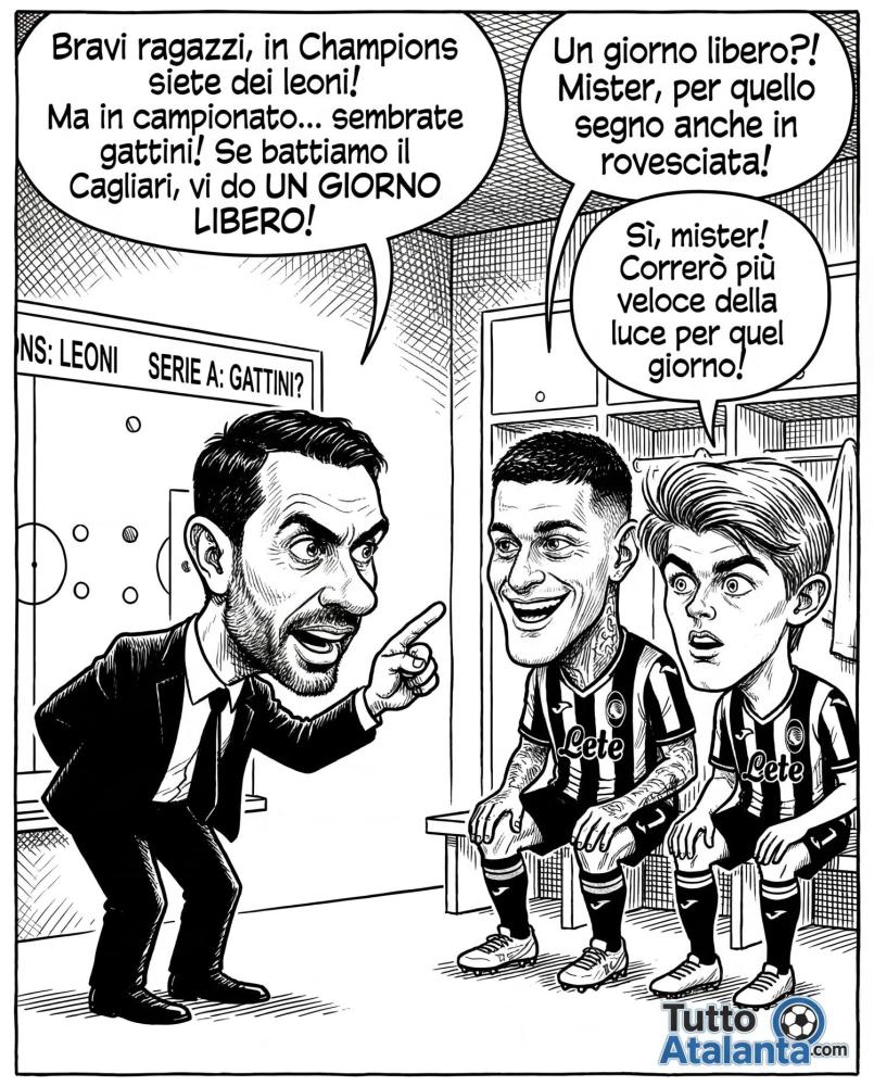 La nostra matita satirica fotografa perfettamente il momento psicologico dello spogliatoio. Da un lato c'è il mister, che alla lavagna tattica evidenzia il paradosso nerazzurro: "Leoni in Champions, Gattini in Serie A?". Palladino non accetta cali di tensione e lancia la sfida ai suoi gioielli, Scamacca e De Ketelaere: battere il Cagliari per ottenere l'unico premio che conta davvero quando si gioca ogni tre giorni.