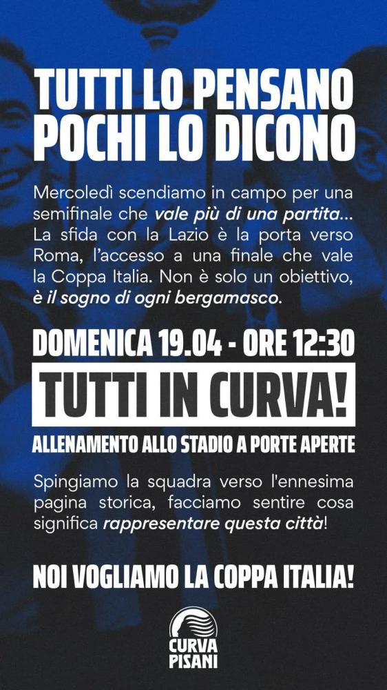 L'adrenalina sale a dismisura all'ombra di Città Alta in vista del crocevia più infuocato della stagione in Coppa Italia. L'Atalanta si prepara ad affrontare il delicatissimo e decisivo ritorno della semifinale contro la Lazio e, per un'occasione di tale portata, il cuore pulsante del tifo bergamasco ha deciso di scendere in campo in anticipo. La Curva Pisani ha infatti diramato un comunicato viscerale per chiamare a raccolta un'intera provincia, con l'obiettivo di compattare l'ambiente e spingere la squadra guidata con maestria da Raffaele Palladino verso l'atto conclusivo del prestigioso torneo nazionale.