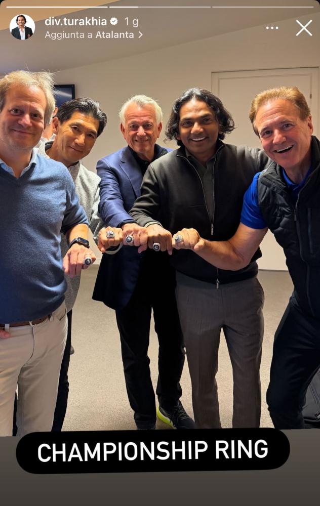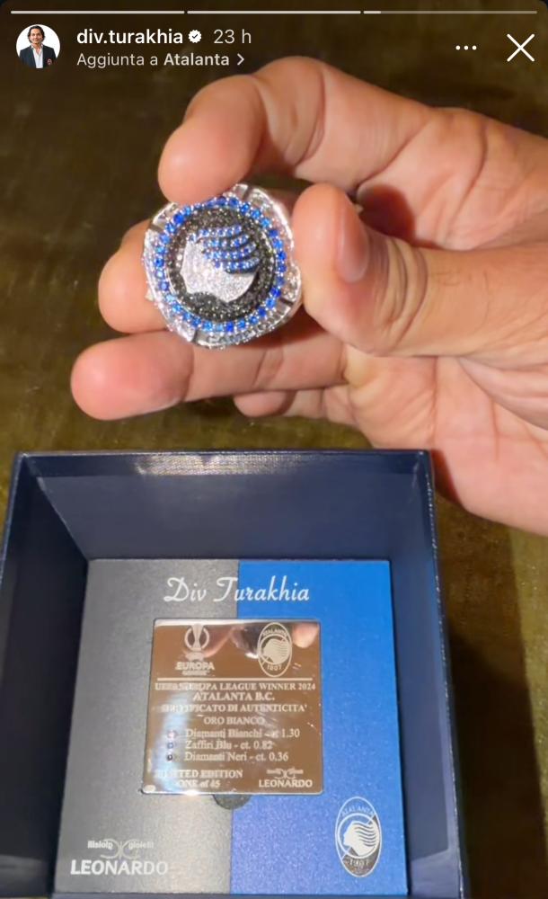 Un anello a tiratura limitata, 45 pezzi nominali, per celebrare una storia straordinaria. Divyank Turakhia, imprenditore e tycoon indiano vicino al co-chairman Stephen Pagliuca, ha scelto di rendere omaggio all’Atalanta in modo inedito e scenografico mostrato un gioiello celebrativo, realizzato in edizione limitata, che riprende il logo nerazzurro della Dea, il simbolo dell'Uefa e le proprie iniziali. Il “championship ring”, come lui stesso l’ha definito, è stato mostrato con orgoglio sui propri canali social, in un video che lo ritrae accanto a Pagliuca e altri soci, tutti con il prezioso gioiello al dito.