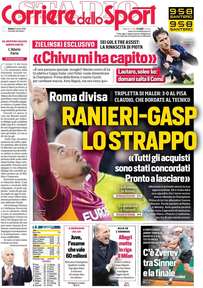 TITOLO PRINCIPALE - Roma divisa, Ranieri-Gasp lo strappo. «Tutti gli acquisti sono stati concordati. Pronto a lasciare». Tripletta di Malen: 3-0 al Pisa. Claudio, che bordate al tecnico. Le opinioni: c'è di mezzo la Roma, la garanzia è Donyell.