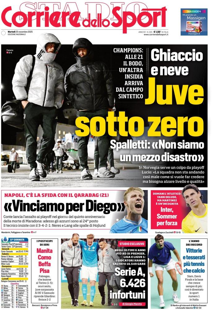 Titolo a tutta pagina dedicato alla spedizione bianconera in Norvegia: "Juve sotto zero". La squadra di Spalletti affronta il Bodo Glimt alle 21 con l'insidia del campo sintetico e del clima polare ("Ghiaccio e neve"). Il tecnico non usa mezzi termini: «Non siamo un mezzo disastro», difendendo il gruppo ma chiedendo di alzare livello e qualità per ottenere un colpo da zona playoff.