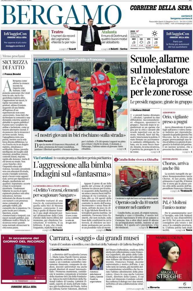 Ecco le notizie principali della prima pagina dell’edizione locale Corriere della Sera - Bergamo in edicola oggi: