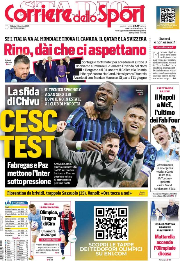- 06:45 PRIMA PAGINA - Corriere dello Sport: "Cest test"