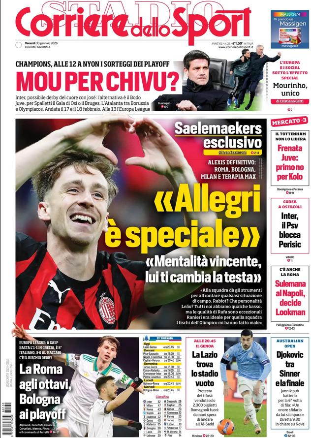 - 06:45 PRIMA PAGINA - Corriere dello Sport: Saelemaekers «Allegri è speciale»
