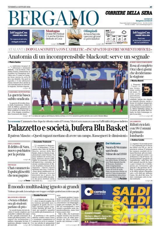 Ecco le notizie principali della prima pagina dell'edizione locale di Bergamo del Corriere della Sera in edicola oggi: