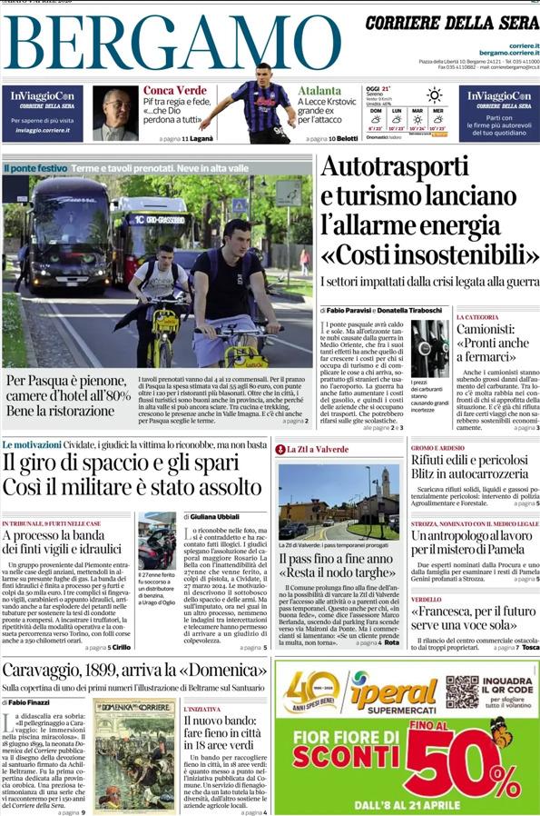 Ecco le notizie principali della prima pagina dell'edizione locale di Bergamo del Corriere della Sera in edicola oggi: