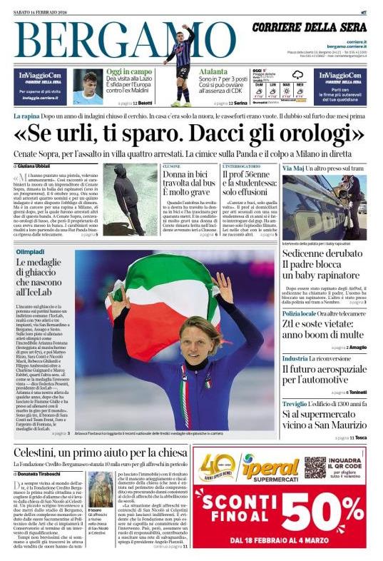 Ecco le notizie principali della prima pagina dell'edizione locale di Bergamo del Corriere della Sera in edicola oggi: