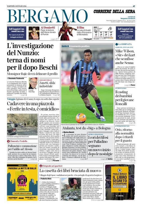 Ecco le notizie principali della prima pagina dell'edizione locale di Bergamo del Corriere della Sera in edicola oggi: