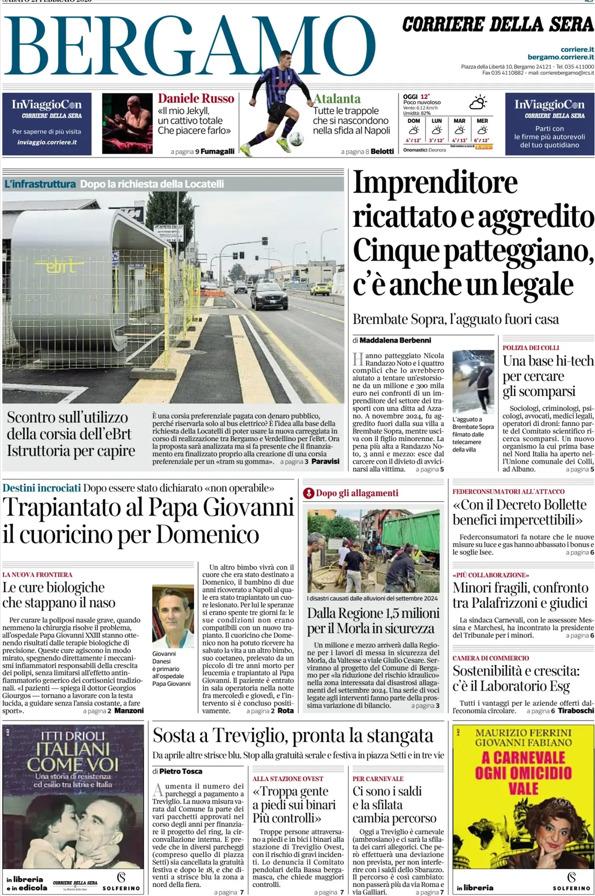 Ecco le notizie principali della prima pagina dell'edizione locale di Bergamo del Corriere della Sera in edicola oggi:
