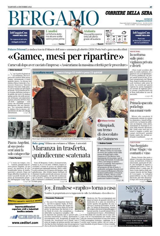 Ecco le notizie principali della prima pagina dell'edizione locale di Bergamo del Corriere della Sera in edicola oggi: