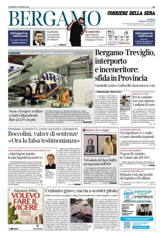 Ecco le notizie principali della prima pagina dell'edizione locale di Bergamo del Corriere della Sera in edicola oggi: