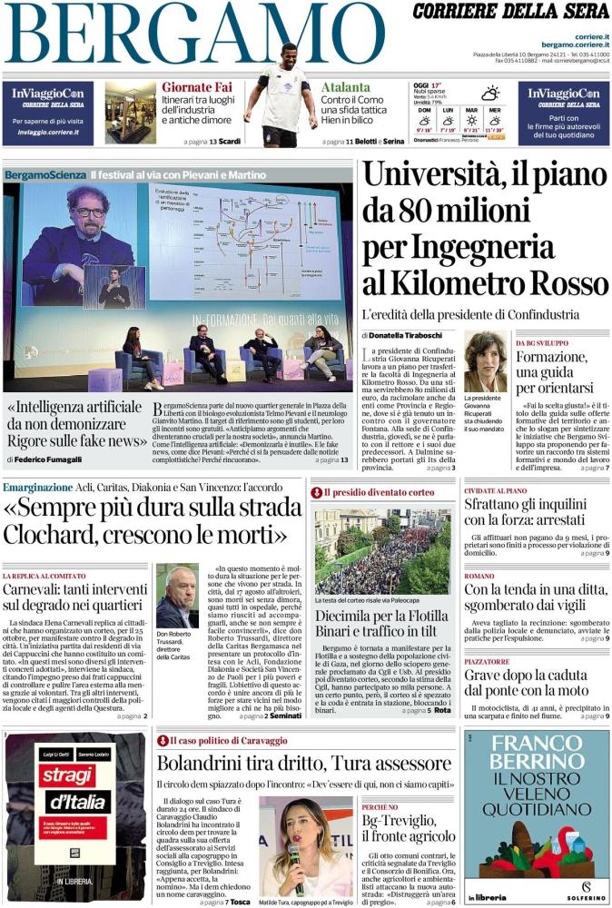 Ecco le notizie principali della prima pagina dell'edizione locale di Bergamo del Corriere della Sera in edicola oggi: