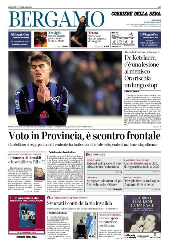 Ecco le notizie principali della prima pagina dell'edizione locale di Bergamo del Corriere della Sera in edicola oggi: