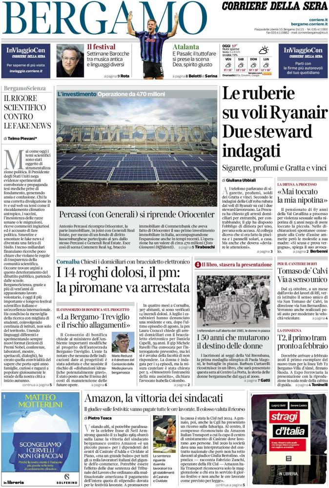 Ecco le notizie principali della prima pagina dell'edizione locale di Bergamo del Corriere della Sera in edicola oggi: