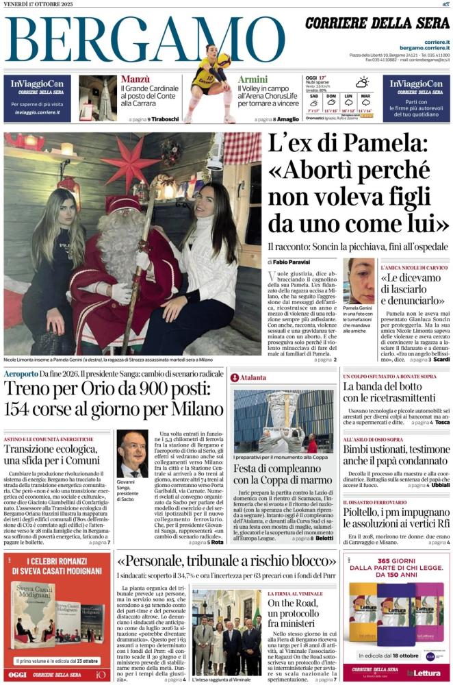 Ecco le notizie principali della prima pagina dell'edizione locale di Bergamo del Corriere della Sera in edicola oggi: