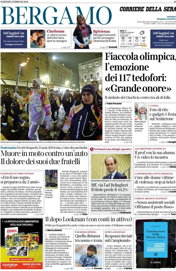 Ecco le notizie principali della prima pagina dell'edizione locale di Bergamo del Corriere della Sera in edicola oggi: