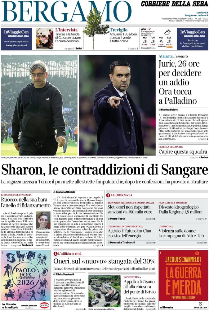 - 06:45 PRIMA PAGINA - Corriere di Bergamo: "Juric, 26 ore per decidere un addio. Ora tocca a Palladino"