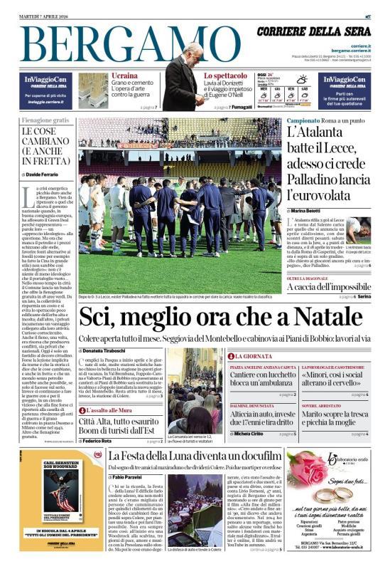 Ecco le notizie principali della prima pagina dell'edizione locale di Bergamo del Corriere della Sera in edicola oggi: