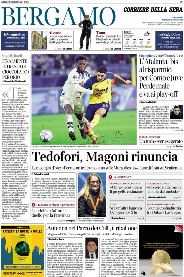 Ecco le notizie principali della prima pagina dell'edizione locale di Bergamo del Corriere della Sera in edicola oggi: