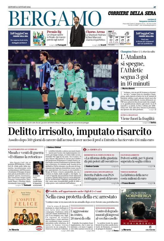 Ecco le notizie principali della prima pagina dell'edizione locale di Bergamo del Corriere della Sera in edicola oggi: