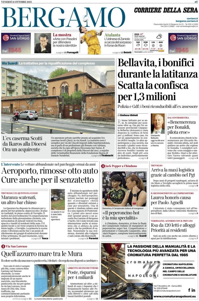 Ecco le notizie principali della prima pagina dell'edizione locale di Bergamo del Corriere della Sera in edicola oggi: