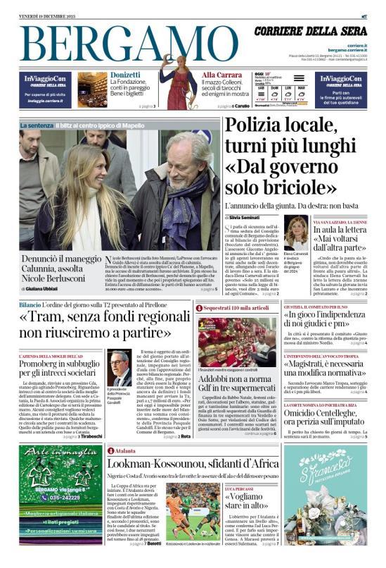 Ecco le notizie principali della prima pagina dell'edizione locale di Bergamo del Corriere della Sera in edicola oggi: