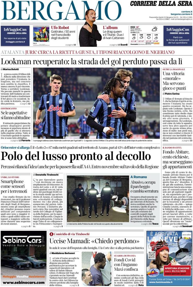 Ecco le notizie principali della prima pagina dell'edizione locale di Bergamo del Corriere della Sera in edicola oggi: