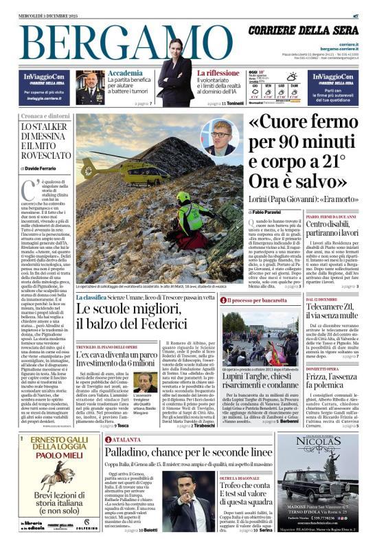 Ecco le notizie principali della prima pagina dell'edizione locale di Bergamo del Corriere della Sera in edicola oggi: