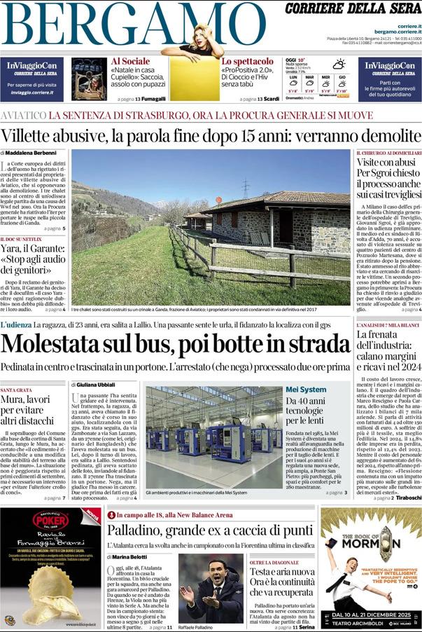 Ecco le notizie principali della prima pagina dell'edizione locale di Bergamo del Corriere della Sera in edicola oggi: