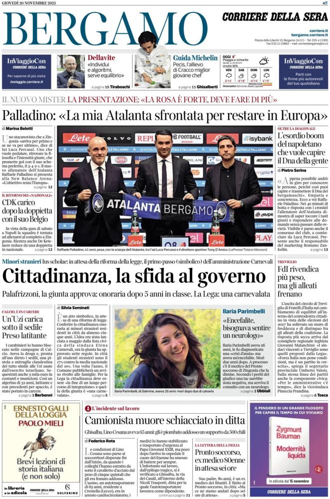 - 06:45 PRIMA PAGINA - Corriere di Bergamo: Palladino: «La mia Atalanta sfrontata perrestare in Europa»