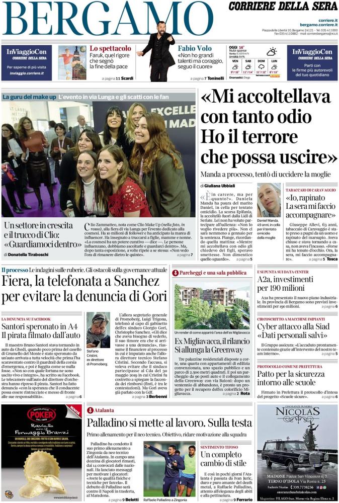 Ecco le notizie principali della prima pagina dell'edizione locale di Bergamo del Corriere della Sera in edicola oggi: