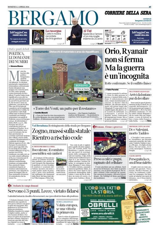 Ecco le notizie principali della prima pagina dell'edizione locale di Bergamo del Corriere della Sera in edicola oggi:
