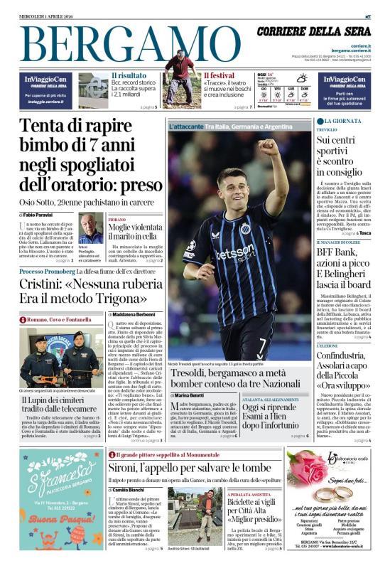 Ecco le notizie principali della prima pagina dell'edizione locale di Bergamo del Corriere della Sera in edicola oggi: