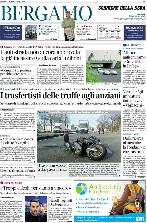 Ecco le notizie principali della prima pagina dell'edizione locale di Bergamo del Corriere della Sera in edicola oggi: