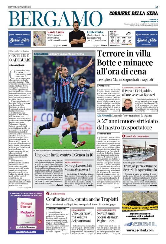Ecco le notizie principali della prima pagina dell'edizione locale di Bergamo del Corriere della Sera in edicola oggi: