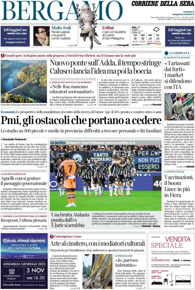 Ecco le notizie principali della prima pagina dell'edizione locale di Bergamo del Corriere della Sera in edicola oggi: