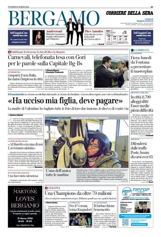 Ecco le notizie principali della prima pagina dell'edizione locale di Bergamo del Corriere della Sera in edicola oggi: