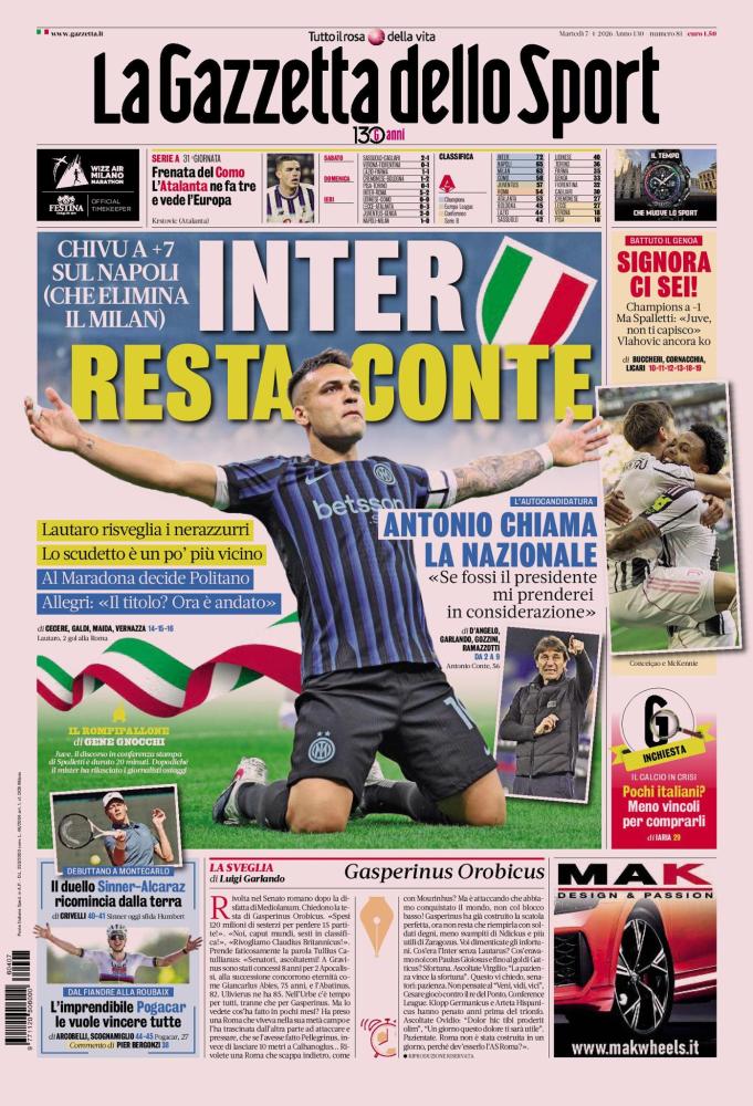 - 06:45 PRIMA PAGINA - Gazzetta dello Sport: "Inter, resta Conte"