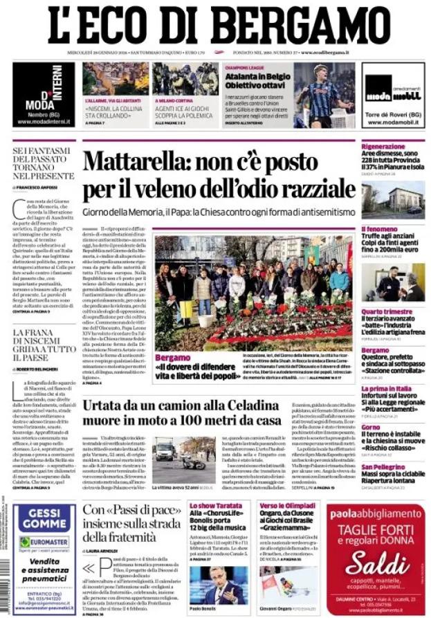 Ecco le notizie principali della prima pagina dell’edizione cartacea de L’Eco di Bergamo in edicola oggi: